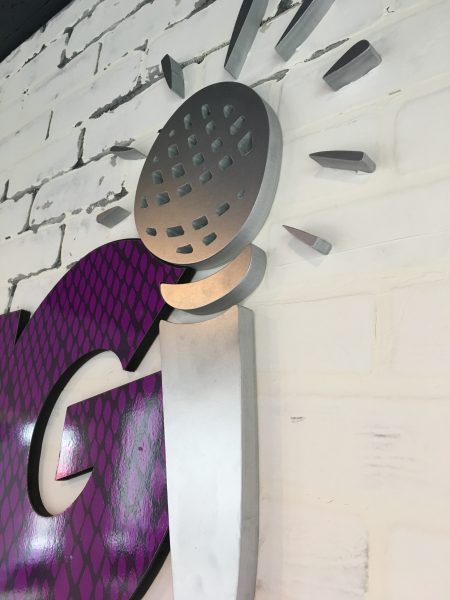 grand opening. They approached Spark Signs with the need for many signs to be produced prior to their debut, which was fast approaching. We produced multiple signs to match their flair for vocal creativity. For the outdoor building sign, we routed a 6 ft. x 5 ft. flat panel to the shape of their logo and then added an 8 ft. long sign just beneath calling out the services they provide (Lessons/Classes, Karaoke & Parties). A matching lobby sign was also placed just inside the entrance. We placed the logo on a 4 ft. x 3 ft. piece of clear acrylic and to add dimension used ‘standoffs’ to pull the acrylic off the wall several inches. The main stage is complemented by a ‘feature’ sign on the back wall, which will be showcased in many photo opportunities! We crafted their logo with 1” thick PVC, overlaying the letters with high-quality vinyl and a gloss overlaminate to make it pop. Separate pieces included a metallic colored microphone that twisted its way down the side of the sign and the company’s tagline, “Grab Life by the Mic.” We created door graphics and incorporated a disco ball and hours of operation for the main door. And we designed, printed and produced two large banners and directional signs that were placed throughout the region to promote the grand opening.