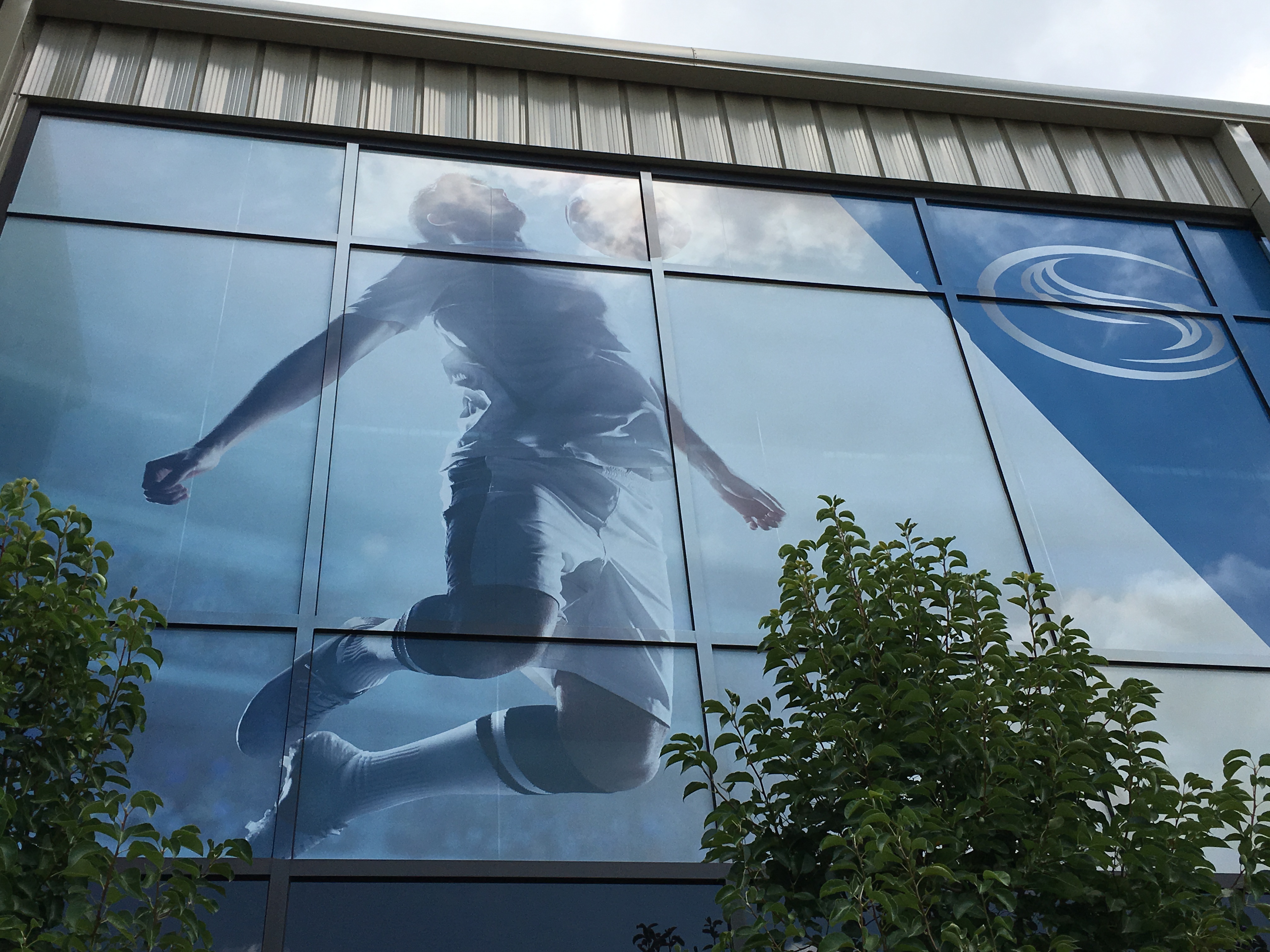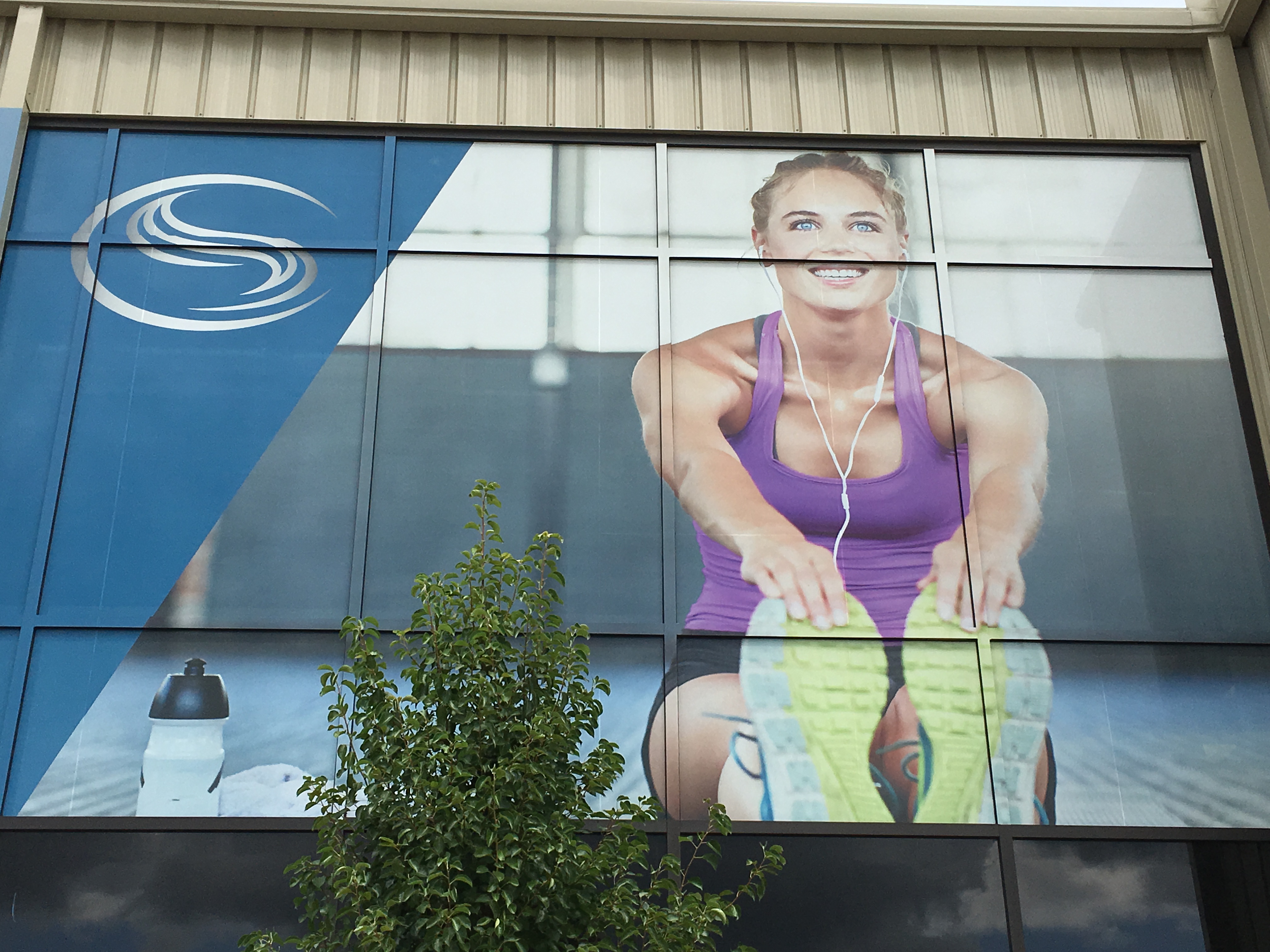 performing site surveys to get precise measurements so their logo and pictured athletes in their sporting element would be visible and properly placed on the building side. After material testing, we decided the Clear Econoview Perforated 60/40 Vinyl was the perfect material for the project because it creates a vibrant picture while still allowing the natural sunlight to pass through the window. Within a week we placed 40 15-foot vinyl strips on the windows creating an almost 3,000 square-foot mural. Now the Cool Springs Sporting Complex has a building welcoming athletes from all over Western Pennsylvania!