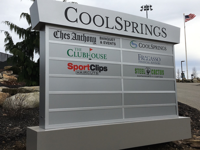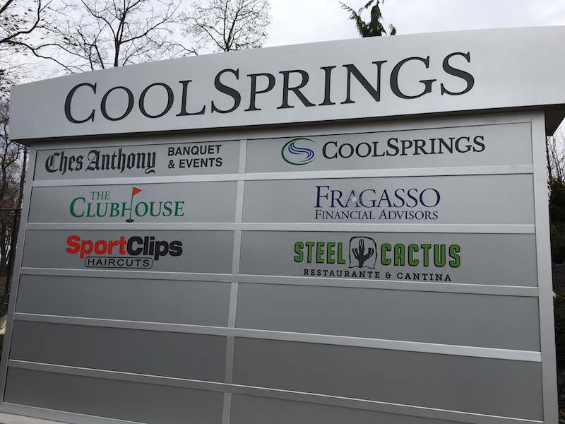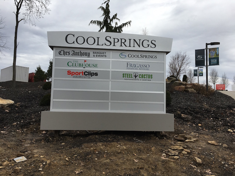 Cool Springs has built a beautiful campus with many resources, from a sports complex, golf facility, retail plaza, townhomes and a memory care facility. To let people know all that comprises the campus, our team designed, fabricated, and installed two monument signs, one at each of the two entrances at the Cool Springs complex.