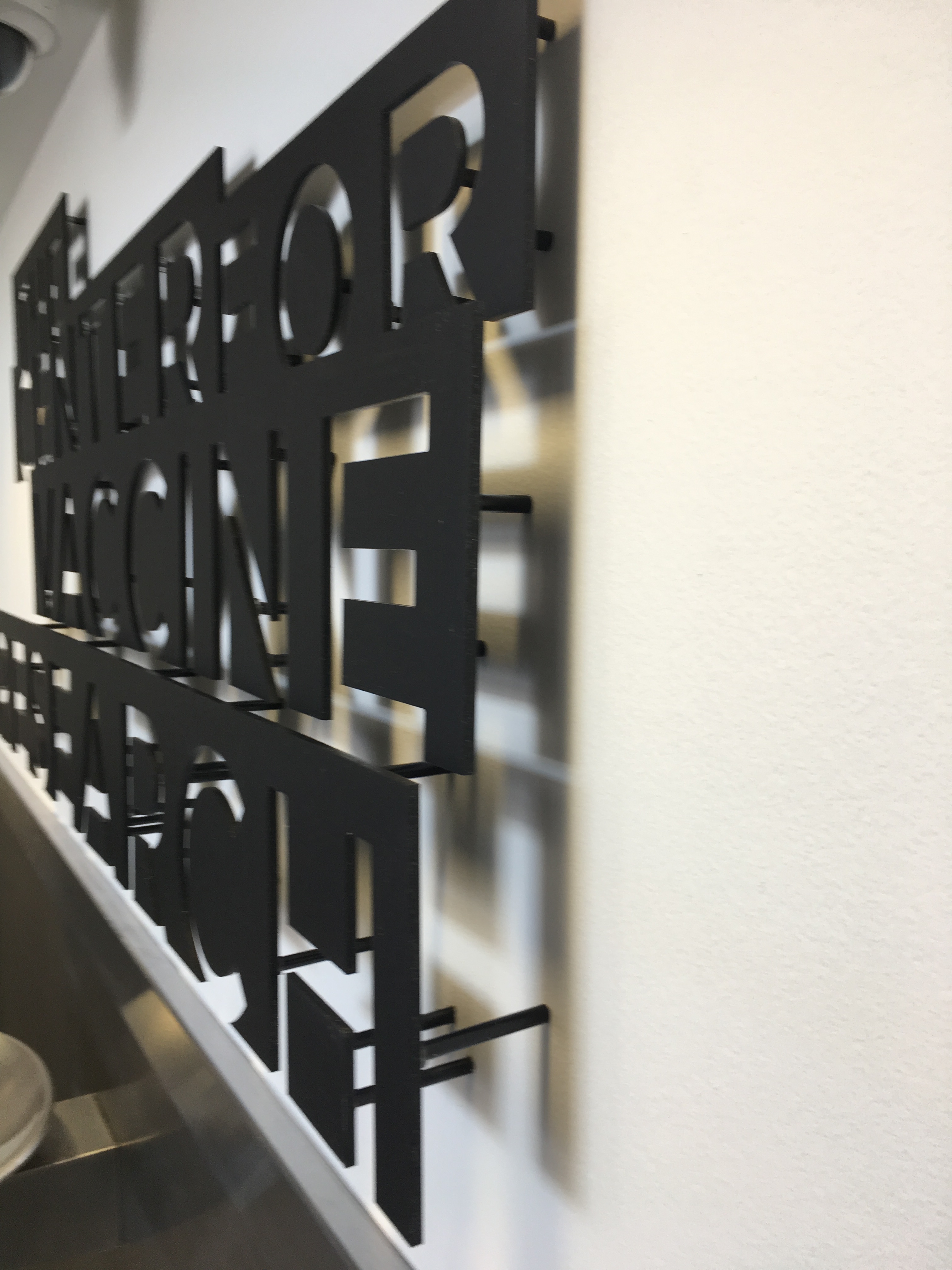 To ensure the signage met the standards of our clients, we worked extensively with CVR and a partner fabricator. We presented several options with our client until they were more than satisfied with the design. We were able to fabricate the signs by routing the letters “The Center for Vaccine Research” out of ¼” matte black PVC and placing them in three separate rows. Each row was mounted off the wall at a different depth thus creating a “stepped” effect