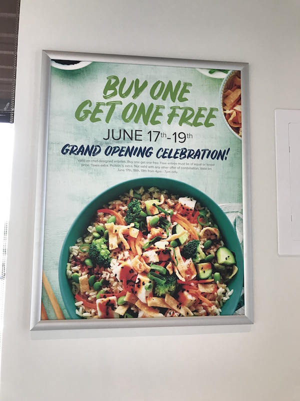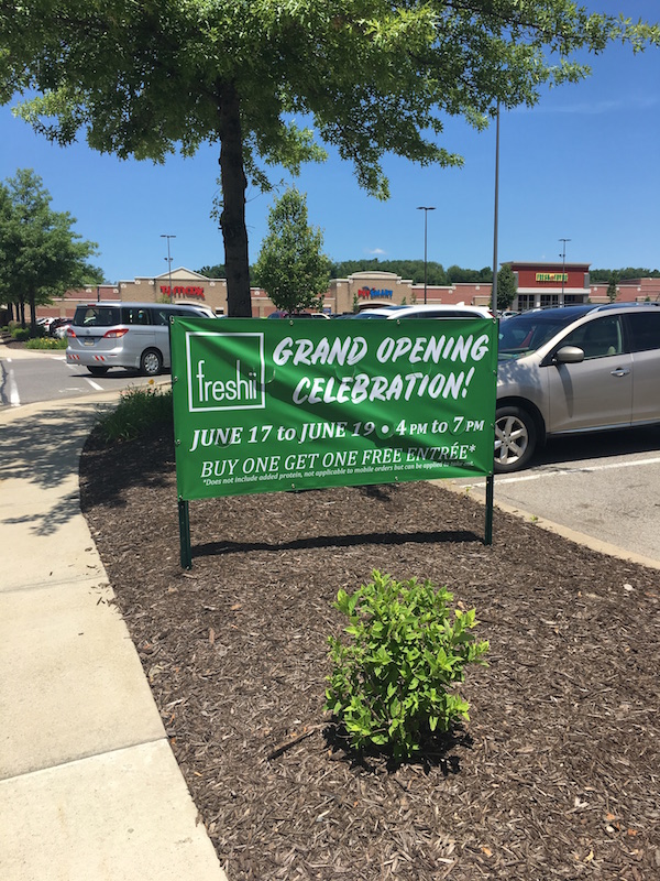 The photos show the exterior channel letter signs on both the side of the building and above the restaurant’s entrance. Also included are shots of the PIN letters we installed and grand opening banners we installed. To see more photos from this project, check out the Freshii Project album on our Flickr.